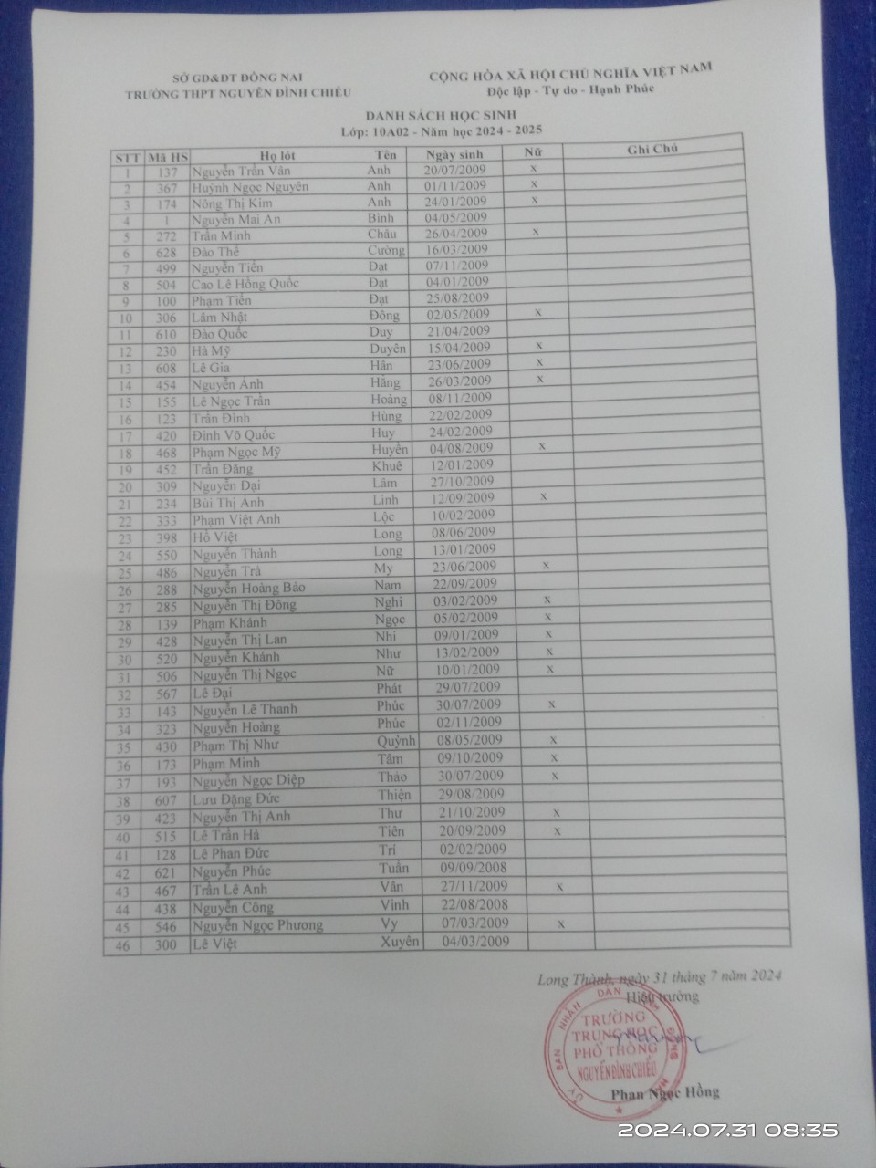 Danh Sách học sinh lớp 10 năm học 2024 - 2025